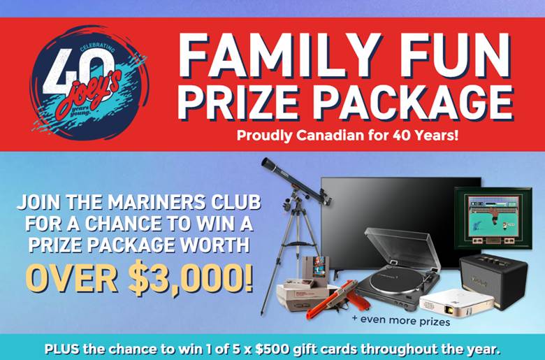 Along with our anniversary specials, there’s still time to enter the Joey’s 40th Anniversary Giveaway, which closes on October 31, 2025. To enter, simply sign up to The Mariner’s Club during the contest period. Five winners will be randomly selected throughout the year to each receive $500. At the end of the contest, one lucky grand prize winner will be awarded a Family Fun Prize Package valued up to $3,000 CAD.